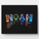 This image is a photograph of handmade letters, which change randomly, producing unique patterns and colors of light. The name Noah is reflected in still water, with floating foil hexagons. The letters look as if they're carved from crackled ice or crystal. If you can't find a name you want, please get in touch, and I'll put it on my list. Please see NamesInLights.co.uk for larger examples of the standard of photography on these products.