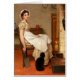 A new chambermaid is tired from the day and is sitting down. A black cat sits near her by the fire. It is very comfortable looking and sweet and nice.