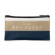 A great gift for a new bride. This little bag is perfect for getting all your makeup to the wedding or a perfect honeymoon carryall. Nautical navy blue offset the faux gold leather. Add your new last name and you wedding date to the back to make it truly one of a kind.