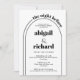 The Night Before arch black and white wedding rehearsal dinner Invitation. This Rehearsal Dinner Invitation for The Night Before wedding is a stunning combination of black and white. The invitation features an elegant arch design that adds a touch of sophistication. The phrase 'the night before' is beautifully written in a curved text, following a gentle curve that extends to the right, creating a sense of movement. The names of the couple are emphasized with bold typography, making them stand out. To add a personal touch, the back of the invitation showcases a lovely photo of the couple, capturing their love and happiness.