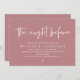 Announce your happily ever after in style with our modern classy dusty rose pink theme design (The Night Before) wedding rehearsal celebration invitation card. It is ideal for couples who have decided to celebrate the night before their big day. With its sophisticated yet playful design, this invitation is sure to set the tone for an unforgettable event. The invitation card features modern romantic script design, adding a touch of timeless elegance to your celebration. Designed by TeeshaDerrick
