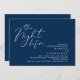 Announce your happily ever after in style with our modern navy blue theme design (The Night Before) wedding rehearsal celebration invitation card. It is ideal for couples who have decided to celebrate the night before their big day. With its sophisticated yet playful design, this invitation is sure to set the tone for an unforgettable event. The invitation card features modern romantic script design, adding a touch of timeless elegance to your celebration. Designed by TeeshaDerrick