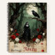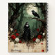 A woman in black gazes at a raven perched on a tree branch in a mysterious forest under a full moon. Red and white roses form a border near the bottom. Beautiful, gothic, vintage fairy tale image.