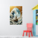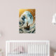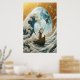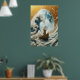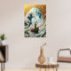 An old man in a small boat fishes in a giant wave with a large moon in the background. He is dressed in white robes and is holding a fishing rod. The wave is crashing around him, but he seems unfazed.