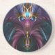 The alien portrait has piercing blue eyes, with a metallic gold brow structure, an ornamental violet blue head structure and deep rose facial flaring on either side of its face.