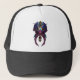 The alien portrait has piercing blue eyes, with a metallic gold brow structure, an ornamental violet blue head structure and deep rose facial flaring on either side of its face.