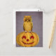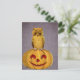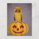 Vintage illustration in orange of an owl sitting on top of a jack o lantern