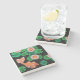 The coasters are gorgeous, a quality feel and heavy weight. They look like a precious archeological find. A rustic stone juxtaposed with a modern floral black and white print. I like the way the print goes slightly imperfect on the cut stone edges giving them a kind-of natural beauty.