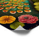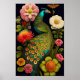Poster print features a colorful peacock and a variety of enchanted flowers. Botanical digital painting in a modern Haeckel style.