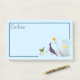 This whimsical design features a trio of feathered friends; a purple peacock, a green duck and a yellow chick. You can customise the text area and the background colour.