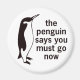 The penguins tell us what to do, so wear a penguin yourself. Useful in so many situations. Get rid of those guests who stay too long. Hand them this button, and gently shove them out the door. Or, if you are in charge of a round of corporate layoffs, these would be great for handing out with the pink slips. Use your imagination, but also employ your penguin properly, with power and perseverence.