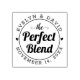 The perfect blend quote and hearts wedding rubber stamp wedding wood stamp. It showcases your names and date of wedding in curved text, the love quote "The Perfect Blend" in bold typography and is accented with two hearts.