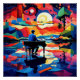A.I .created print of vibrant scene features a person playing a piano against a mesmerizing, starry night sky above a colorful cubist, surreal landscape includes rolling hills, trees, and a lake reflecting the sky's luminous celestial bodies