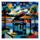 A.I .assisted print of a vibrant surreal landscape features a grand piano awaiting its pianist, set on a colorful, geometric-patterned field. The sky is filled with swirling circles resembling a starry night, and the scene is surrounded by lush greenery and a serene river.