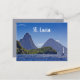 This postcard features The Pitons in St. Lucia. The Pitons are two mountainous volcanic plugs, volcanic spires, located in Saint Lucia. Gros Piton is 2,618.9 ft. high, and Petit Piton is 2,438 ft. high. They are linked by the Piton Mitan ridge. The Pitons are a World Heritage Site. Photo credit: cjuneau, 2015.