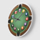 Rack 'em up with this creative billiards-themed wall clock, designed to look like a bird's-eye view of a classic pool table. Featuring vibrant numbered billiard balls as hour markers set against a felt-green background and wood-grain rail, this clock is the ultimate accessory for any game room, man cave, or sports bar. It’s a high-quality, functional piece of decor that hits the mark for pool sharks and casual fans alike.