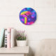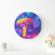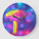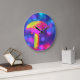 Neon colored psychedelic Mushroom in pink and yellow against a bright blue and purple sparkling bokeh background