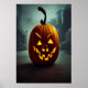 A orange pumpkin with a scary face travelling down the street of the city on Halloween. This is a AI generated art.