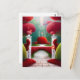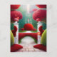 Colourful AI generated fantasy digital art postcard features a Wonderland style landscape of whimsical red trees and topiaries .