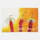 Still life of three red chilli peppers wearing sombrerors made of lemon and tangerin against the textured background of hot and sunny Mexican day. Kitchen Towel. Funny friendship theme. You can change or delete the template text Hola, Amigo!