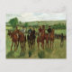 A fine art postcard with the painting, The Riders (1885), by French artist Edgar Degas (1834-1917). A horseracing portrait of several jockeys on their thoroughbreds in the field.