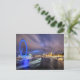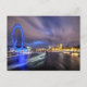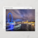 Looking up the River Thames past the London Eye towards the Houses of Parliament, speeding boats leave light trails in the water