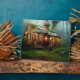 A Steampunk style workshop on a mossy river bank - a tabletop digital art plaque created with AI software