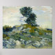 The Rocks. Vincent van Gogh. Landscape in cold green-blue tones. There are stones in the foreground. In the middle ground there is a hillock with a tree and stones. The sky is clouded over. Reproduction of famous works of art images in the public domain.