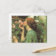 Vintage painting of young woman reaching toward soft pink roses. Fine art by English artist John William Waterhouse.