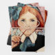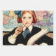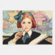 Jessie Willcox Smith was an American artist known for her idyllic imagery of childhood. She was the cover illustrator for the magazine Good Housekeeping for 15 years.A young girl with red hair tied in a blue bow sits at a desk with a large open book, thoughtfully holding a pencil to her mouth. A detailed map of Europe hangs on the wall behind her, indicating a classroom setting.This painting is called “The Scholar”.