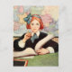 The Scholar, with eyes severe and hair of formal cut. Vintage artwork of a studious red headed girl at school. She is wearing a black and white uniform with a big blue bow in her hair. She is a student, seated at her desk with an opened book, perhaps learning geography or history, since there is a large map of Europe behind her on the wall. Illustration by Jessie Willcox Smith.