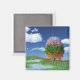 Four seasons appear on a lone tree standing in a grassy meadow. The top branches are bare and snow-covered, giving way to pink blossoms, which turn to dark green leaves, which turn orange and gold and fall to the ground. Amid the autumn leaves on the ground are blue spring flowers and melting snow.