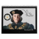 King Richard has enjoyed a remarkable resurrection in the Twenty- First Century. His bones were dug up in a Leicester car park and he will be re-buried in a fine tomb in Leicester Cathedral. The face of Richard in all the calendar pages except for the back cover is from a model of his face made from his actual skull. On the back is a famous portrait of the king painted a few years after his death. We've added a fine tabby to keep Richard company. Included in the calendar portrayals are both York Minster and Leicester Cathedral. The two churches both hoped to to claim Richard but Leicester won out, and the King will have his final resting place there.