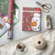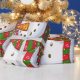 This image is of a snowman family, all dressed in their coloured winter hats and scarves. A carrot for their nose and coloured buttons for their eyes and mouth. A green and red backround with snow confetti has been added. A green border was also added. This wrapping paper is available in assorted styles and sizes.