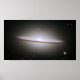 This is a reproduction of the majestic image of the Sombrero Galaxy by the Hubble Space Telescope. Captured is the white, bulbous core of the galaxy encircled by thick dust lanes in the spiral arms seen edge on. The galaxy is at the southern edge of the Virgo cluster of galaxy and is a massive object equivalent to 800 billion solar masses. The galaxy is 50,000 light years across and 28 million lightyears from Earth. The image was released in October, 2003.