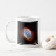 The Southern Ring Nebula in near-infrared light, captured from the James Webb Space Telescope. This scene was created by a white dwarf star - the remains of a star like our Sun after it shed its outer layers and stopped burning fuel though nuclear fusion. Those outer layers now form the ejected shells all along this view. In this Near-Infrared Camera (NIRCam) image, the white dwarf appears to the lower left of the bright, central star, partially hidden by a diffraction spike. The same star appears - but brighter, larger, and redder - in the Mid-Infrared Instrument (MIRI) image. This white dwarf star is cloaked in thick layers of dust, which make it appear larger. Over thousands of years and before it became a white dwarf, the star periodically ejected mass - the visible shells of material. As if on repeat, it contracted, heated up - and then, unable to push out more material, pulsated. Stellar material was sent in all directions, and provided the ingredients for this asymmetrical landscape. Today, the white dwarf is heating up the gas in the inner regions - which appear blue at left and red at right. Both stars are lighting up the outer regions, shown in orange and blue, respectively. Peer at the circular region at the centre and you'll see a wobbly, asymmetrical belt of material. This is where two bowls that make up the nebula meet. (In this view, the nebula is at a 40-degree angle.)