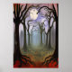 A spooky forest with spooky trees and red and green ground, the moon is shining in the sky. This is a AI generated art