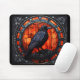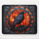 Depicted in stained glass, a spooky, creepy raven turns his gaze on the viewer.