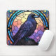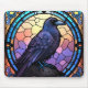 Depicted in stained glass, a spooky, creepy raven turns his gaze on the viewer.