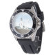 This drawing features a white, green and black lighthouse overlooking the sea. The sky is blue with a few clouds. White houses with green roofs surround the lighthouse. This design is available on women, men and children's watches.