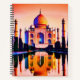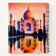 Journal in an illustration of the Taj Mahal, reflected in the water, and backed by a deep coral orange sunset sky