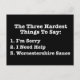 The Three Hardest Things To Say: 1. I’m Sorry 2. I Need Help 3. Worcestershire Sauce. This funny quote list is a great Christmas or birthday gift for anyone who appreciates profound sayings about life, but also have a sense of humour. Perfect for cooks. The first two on the list can be the hardest to say, and the third is the hardest to pronounce! You’ll also appreciate this design if you enjoy cooking in the kitchen, and have some Worcestershire sauce in the pantry to cook with!