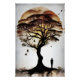 An imposing tree, its intertwined roots like ancient memories, guards secrets among the golden and reddish leaves. A human silhouette observes, while birds fly freely, uniting nature and soul in a poetic embrace. Each watercolor brushstroke is a sigh of peace, reminding us that life grows in roots and dreams.