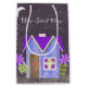 Experience the quiet magic of "Home Sweet Home" at night. This digital collage transforms the classic cottage design into a serene twilight scene, using a palette of moody periwinkles, deep indigo stripes, and a royal purple polka-dot roof. Set against a textured, starry sky with a glowing crescent moon, this piece evokes a sense of peace and wonder. The hand-cut floral accents in shades of violet add a touch of mystery, making this design a beautiful addition to a cosy reading corner, a peaceful bedroom, or any space where you want to invite a sense of calm and whimsy.