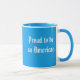 American flag in the shape of the USA map, white star with blue outline, red and blue text The Unites States Of America. The Independence Day and other occasions patriotic gifts and souvenirs for anyone. Coffee mug. Customisable. You can change the image and you can change or delete the text Proud to be an American and the colour of the mug. Enjoy!