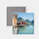 Square souvenir fridge photo magnet of a landscape with boathouses in the village of Fjærland (Mundal) and mountains with reflection in the water of the fjord Fjærlandsfjord, Sogn og Fjordane in Norway, with the text: 'NORWAY, Fjærlandsfjord'. A great souvenir!!