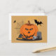 Wacky illustration of popular Halloween characters and elements. Pumpkinhead with human eyes, black cat, witches hat, zombie rising from the grave, skull, and more.