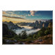 Majestic mountains rise beneath a golden and blue sky, wrapped in serene mist. A delicate geometric web overlays the scene, transforming it into a surreal dream where raw nature meets soft art. Vibrant colours, lush vegetation, and the contrast between realism and abstraction create a work that inspires peace and wonder—perfect for those seeking to connect with the magic of the natural world.