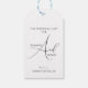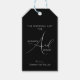 The wedding gift tag for the bride and groom. White custom calligraphy on a black and white reversed colours background. Elegant, minimalistic, eye-catching design.