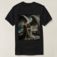 This T-shirt design features a sad angel with huge, feathered wings, sitting alone on dark, rugged rocks by the ocean. The angel has long, red hair and is wearing a flowing, light-coloured (maybe white or off-white) gown. Her head is bowed, covering her face, suggesting grief, weariness, or despair. The background is dark and moody, with stormy waves and a dramatic sky, which emphasizes her isolation and sorrow. The overall feeling is one of beautiful, sorrowful isolation.